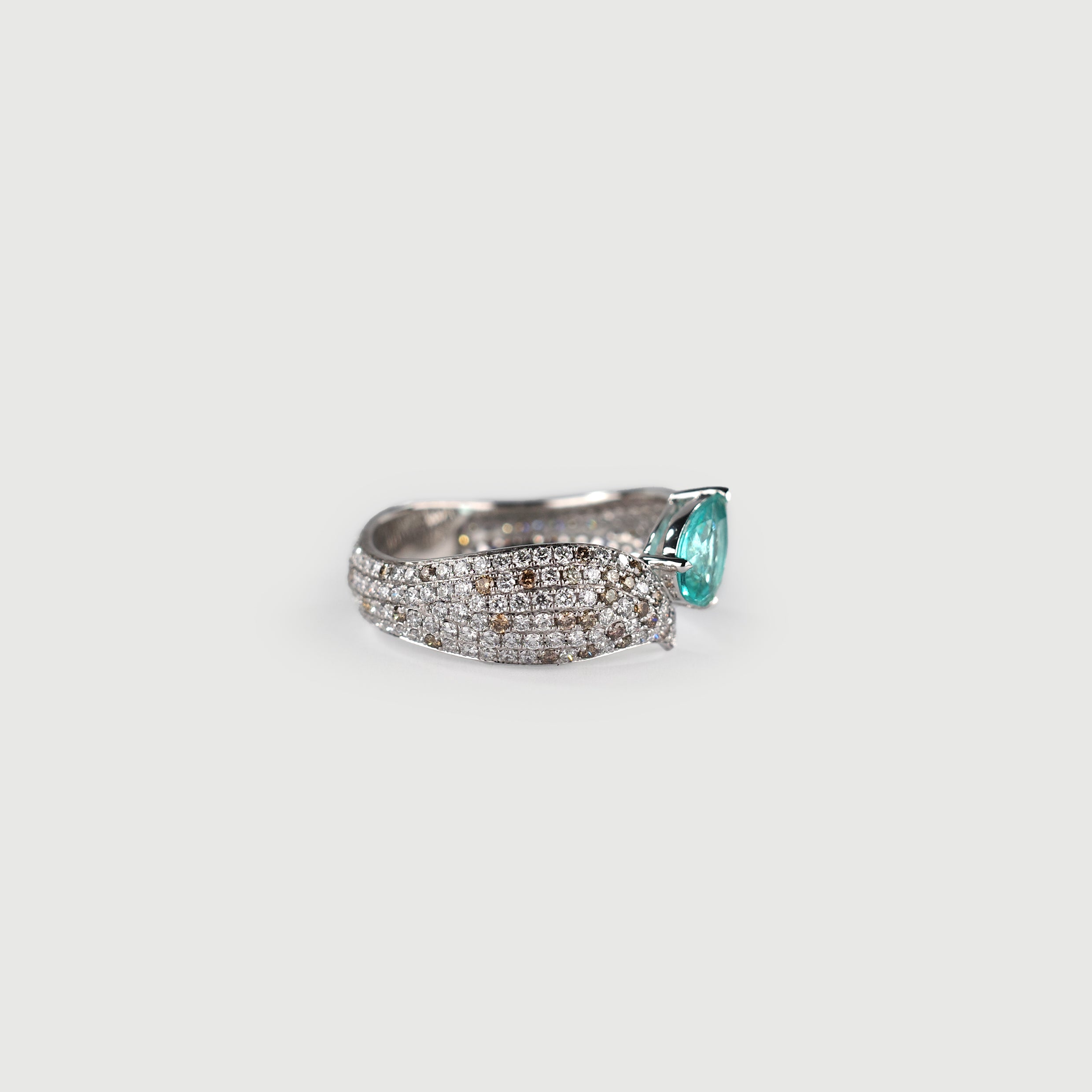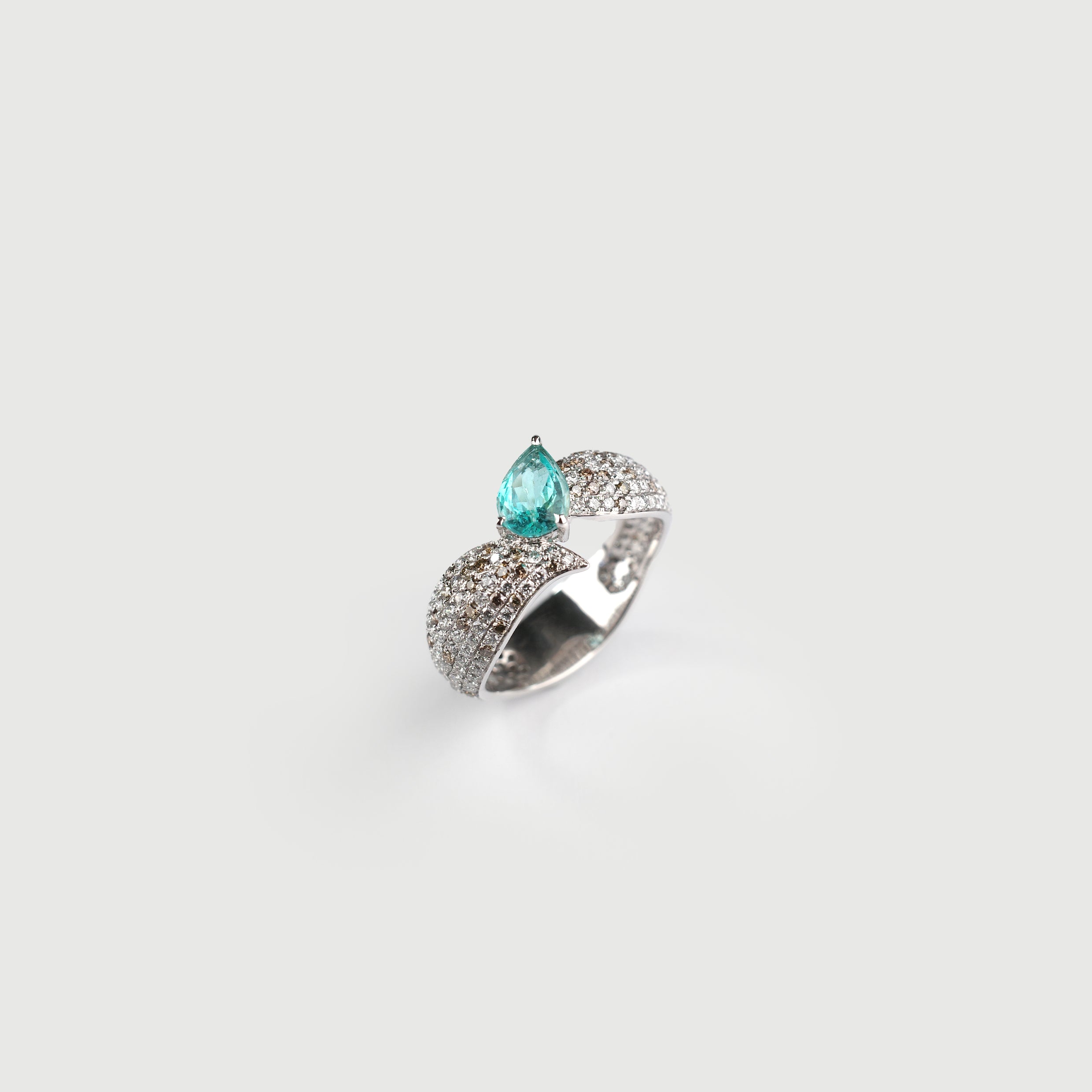 A custom made piece dedicated to the nature. Inspired by the exotic species, Zebra Dove, featuring precious and rare Paraiba turmaline and diamonds.