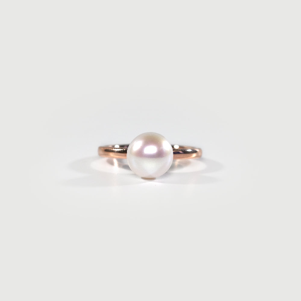 This Akoya pearl ring features a single lustrous pearl with a delicate pinkish sheen, elegantly set in rose gold. The warm tones of the setting beautifully enhance the pearl's natural blush, creating a timeless and refined design.