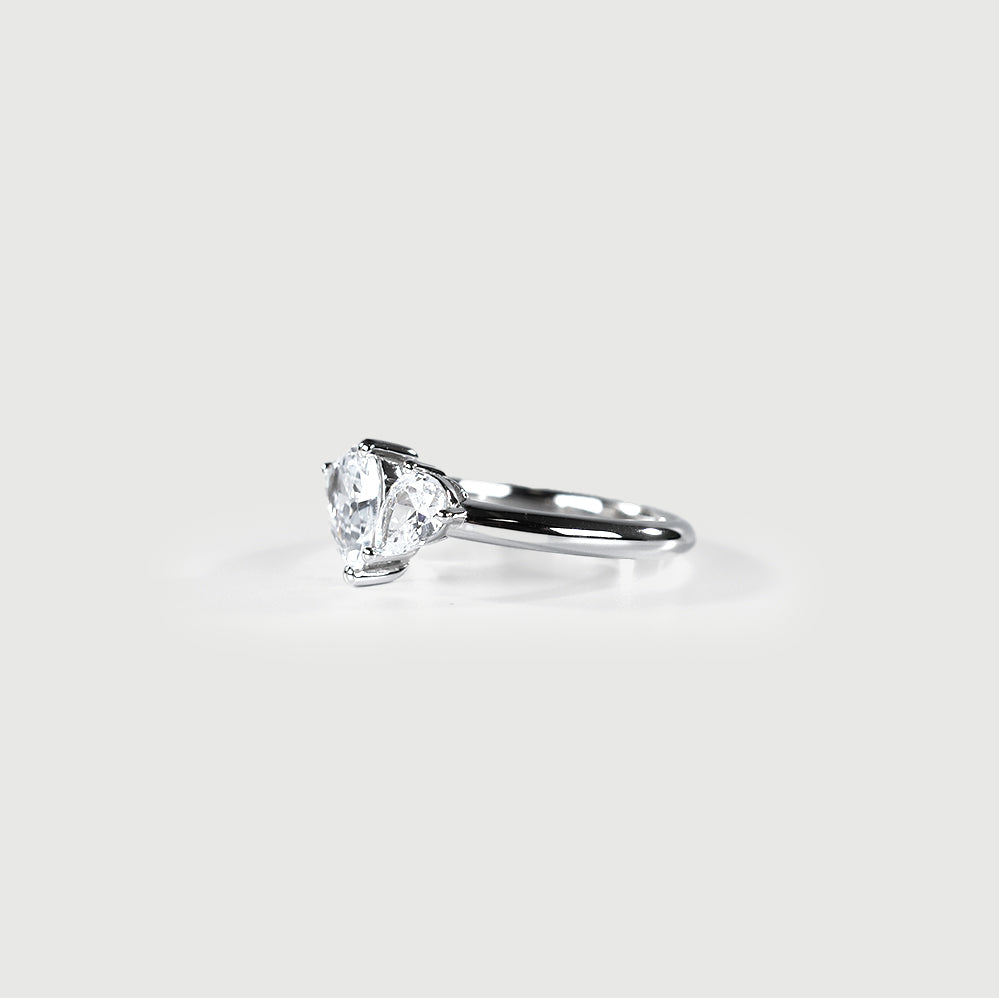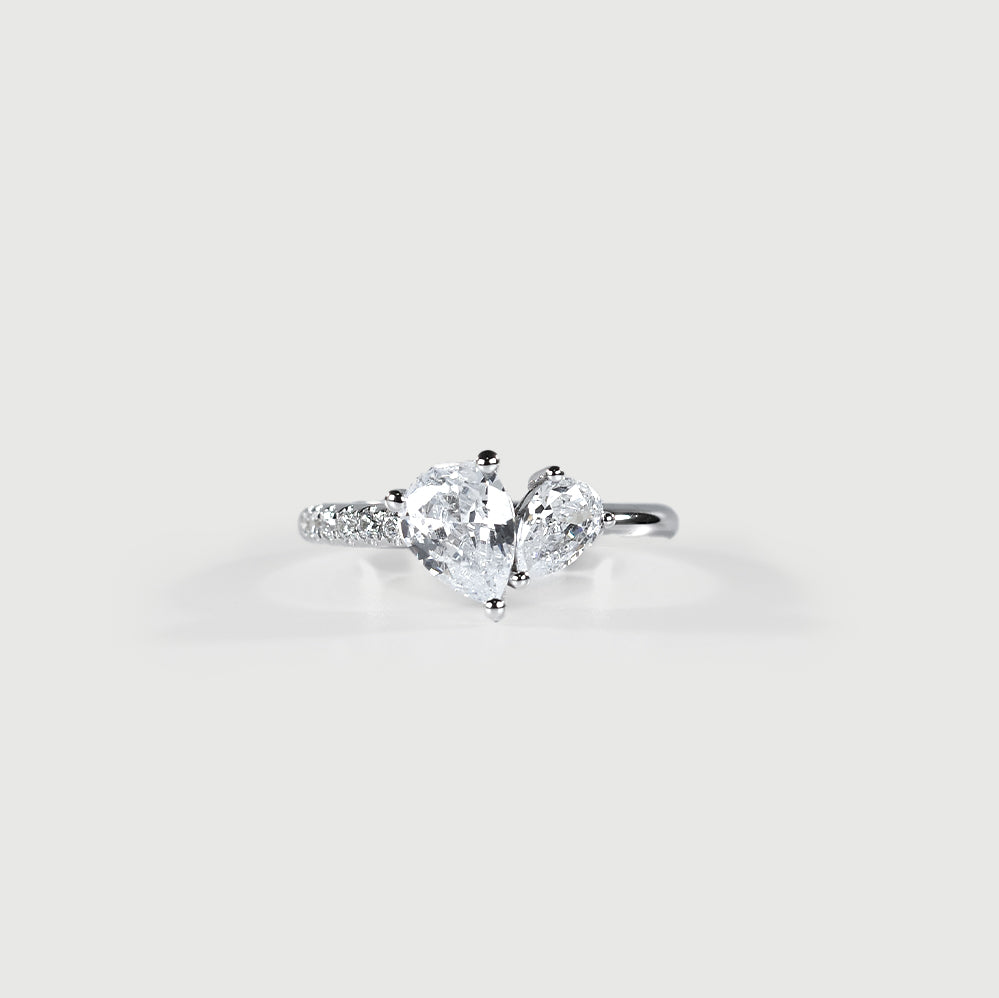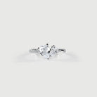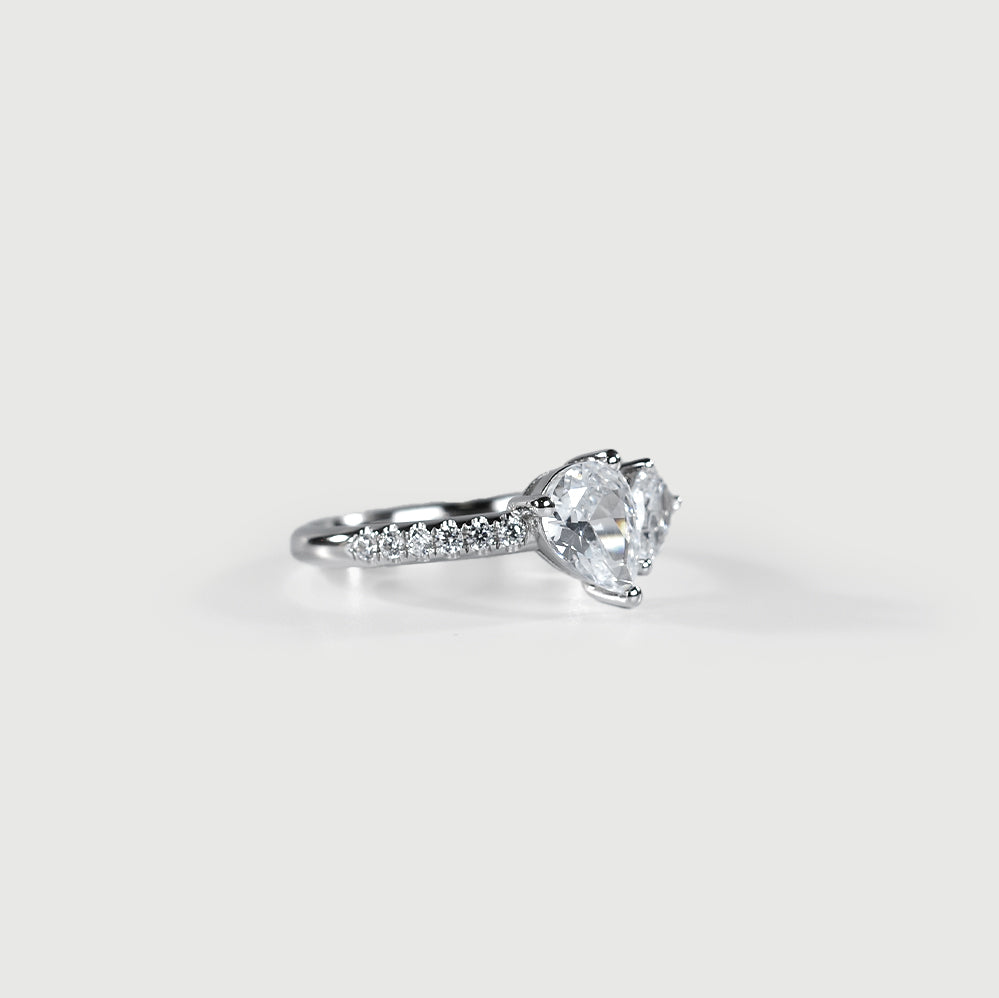 Sophisticated toi et moi ring featuring two graceful pear-shaped stones nestled together in gentle opposition. One half embraces minimalist elegance with a clean setting, while the other sparkles with delicate pavé diamonds cascading halfway around the band.